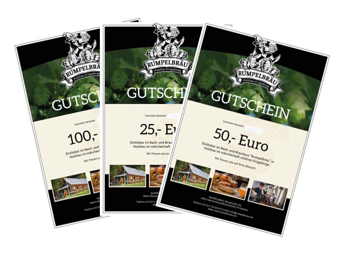 Unsere Gutscheine (Wert: 25 €, 50 € oder 100 €) können Sie im Back- und Brauhaus erwerben oder auch ganz einfach per Mail unter info@rumpelbraeu.de bestellen. Sie können für eine Brauereiführung (mind. 10 Personen), Bierverkostung und natürlich auch für Speisen und Getränke genutzt werden. Oder nehmen Sie bei Ihrem nächsten Besuch eine Geschenkflasche (1,89 l) mit.